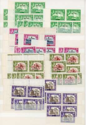 1951-3 Currency Change set mint on stocksheet, blocks and singles, 18+ unmounted of each value, save the 2c (15 only). Extras of many. Also some hinged with at least 2 sets. Different printings of basic stamps are very evident. SG 36-46