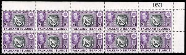1938 (second) printing of the £1, with the distinctive rippled gum. Unmounted o.g. block of ten (5 x 2) from the top right corner of the sheet, with sheet number 053. A rare multiple. SG 163 var