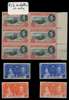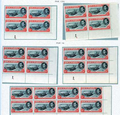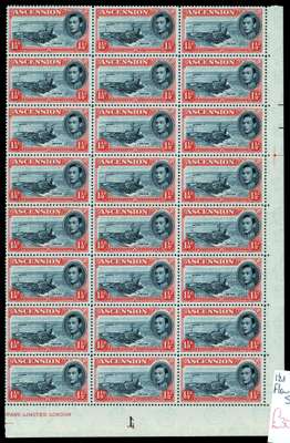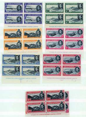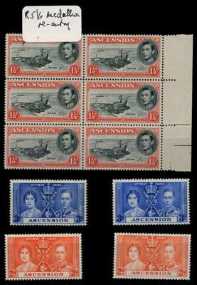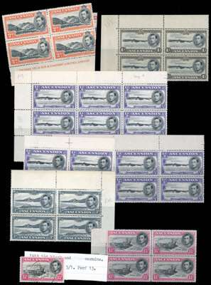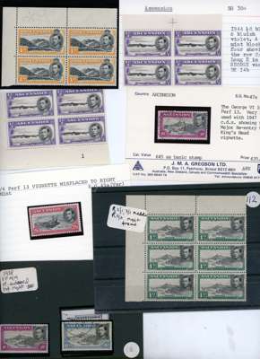 1938-53 KG VI balance with blocks and varieties, listed and unlisted. Includes ½d long ‘E’ blocks (3), davit flaw blocks (2, one lightly toned) and a cut mast and railings block (tiny foxed spot), and 1/- R6/4 re-entry blocks (2 mint, each with the variety unmounted, and a block used on piece; some useful material