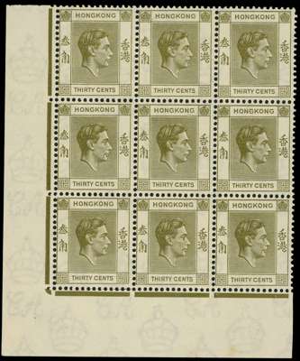 1938-45 30c yellow-olive lower left corner block of nine, o.g., lightly hinged on the top three stamps only, very fresh and fine. SG 151, £1350