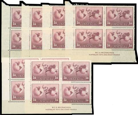 1948 1/6d Hermes on thin ordinary paper McCracken imprint blocks of four, thirty-four examples, unmounted o.g. SG 153b, ASC 163z, $2550