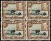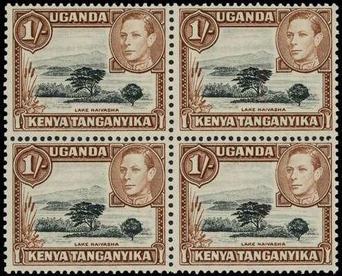 1942-9 1/- perf 13 x 11¾ block of four, lower left stamp with R6/7 Mountain retouch. Fine o.g., hinged on one normal only. SG 145a, ac, £1520