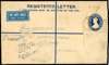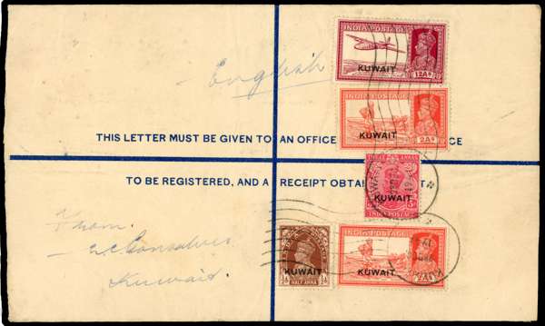 Postal Stationery. 1941 use of an India registered 4a postal stationery envelope size H, uprated in the reverse with KG V 3a, KG VI ½a, 2a (2) and 12a, Type 11 cancels of 28 DEC to UK. Some adhesions and minor staining; a very scarce usage