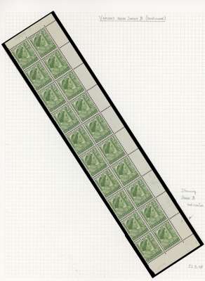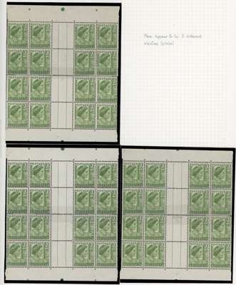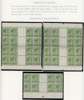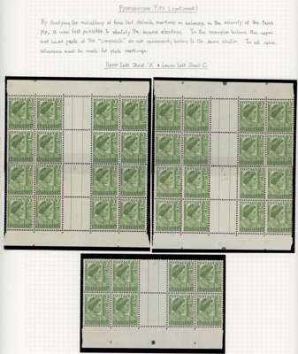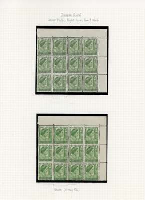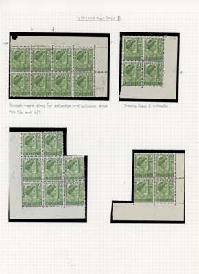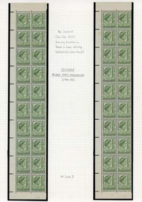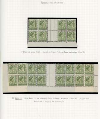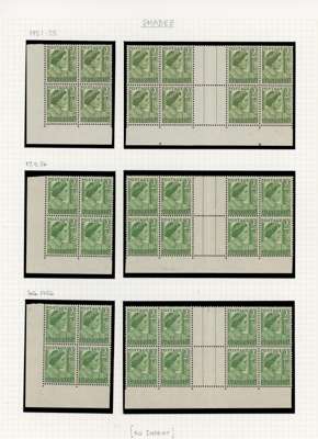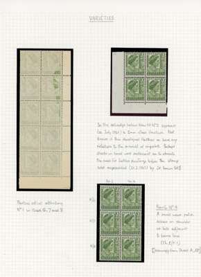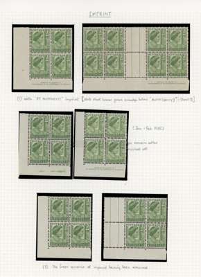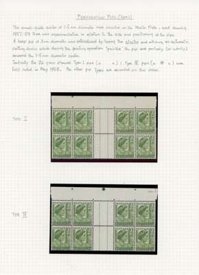 1951-62 2d yellow-green collection (308), no coil stamps, well written up on leaves. Includes partial offset block with three stamps affected, no imprint blocks with plate crack and burnishing marks, shades, imprint blocks, perf pip blocks, flush perfs lower two rows of sheet (folded), two blocks of twenty (2 x 10) with doubled encroachment perfs in left selvedge, two blocks showing lower plate R3/6 RP dropped cliché. etc. A fine collection, apparently ex J.P. Meara but rewritten. SG 237