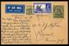 Postal Stationery. 1941 use of KG V India 9p postcard to Kuwait, with added 3½a, Bahrain Air CDSs. Commercial message. Bears reasonable strike of the large boxed PASSED BY CENSOR/ BAHRAIN in violet