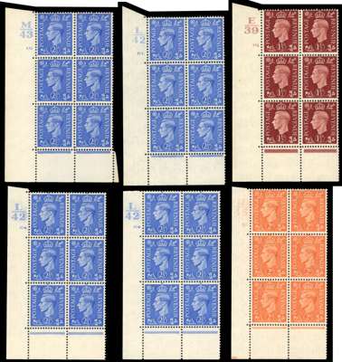 1938-42 group of Cylinder blocks (12) all perf Type 6B, fine o.g., the majority hinged on the selvedge. None of the numbers are recorded in this perf type in the SG Four Kings Specialised catalogue. 1937 ½d Cyl. 31 no dot; 1d 18 no dot; 1½d 71 no dot, 135 dot, 144 dot, 150 no dot and 156 no dot. 1941-2 pale colours 2d 40 dot, 2½d 104 dot (two, one unmounted), 113 dot (mounted) and 131 no dot. A rare group. SG 462/489