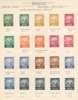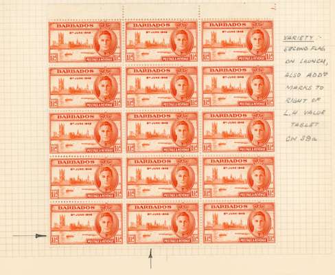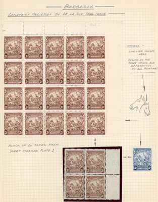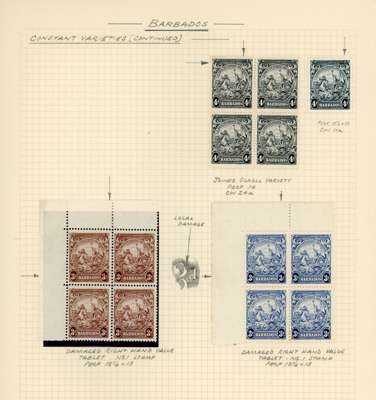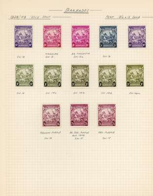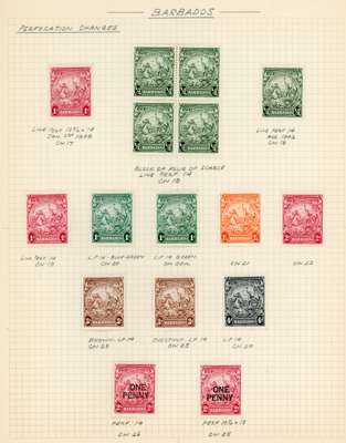 Barbados SG 248-264e mint collection on leaves with all perfs and shades perf CW including 1d perf 13½ x 13, ½d perf 14 single and block of four (lower pair unmounted). Also varieties including 3d brown perf 13½ x 13 block with R4/10, perf 14 block with R4/10, varieties unmounted, and 3d blue single with R4/10; and 4d R7/8 curved line at top, both perfs. The hinged material seems to be first hinge. SG 248/264e