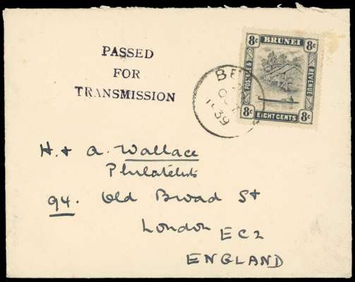 1939 envelope to London with 8c grey, 26 OCT CDS. Fine strike of PASSED/ FOR/ TRANSMISSION at left. Also 1942 envelope to Glasgow with 8c grey, 7 NOV 40 CDS, with a very fine strike of PASSED FOR/ TRANSMISSION/ SINGAPORE/ 68 IN VIOLET