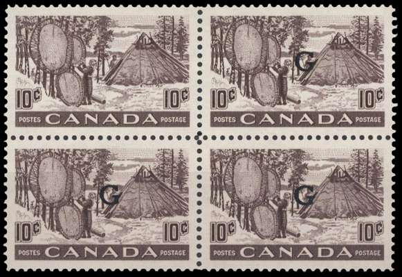 Officials. 1950 10c brown-purple block of four, upper left stamp with ‘G’ omitted, unmounted o.g. SG O191a, £950