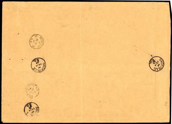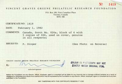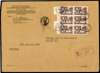 Officials. 1953 registered envelope (10½ x 7½") with marginal block of six 1950 10c brown-purple overprinted ‘G’, one with overprint omitted; additional pieces of selvedge added to make sure the selvedge adhered properly. Sackville N.B. CDSs of FE 14. Envelope with creases, central fold and worn, but a rather splendid non-philatelic use. Vincent Graves Greene Certificate (1982). SG O191a, £650 off cover