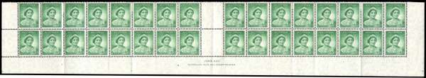 1937 1d emerald-green perf 13½ x 14 lower two rows of sheet, concertinaed for display, showing Plate 7 at left and at right. O.g., quite enthusiastically hinged, an unusual multiple with both numbers. SG 167, ASC 181zr + zs, $1900+