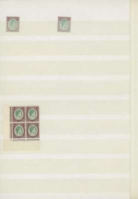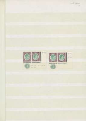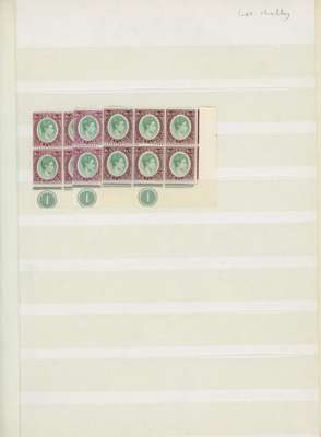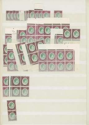 1938-49 5r mint collection divided into three categories, the great majority unmounted. Early chalky paper (with naturally brownish gum) Plate block and plain corner block. Ordinary paper two Plate pairs, seven unmounted blocks, one of eight, and a strip of three. Late chalky paper (white gum) three Plate blocks, one of six, 58 stamps in plain pairs and blocks and nine singles, amply demonstrating the range of shades. SG 397, a
