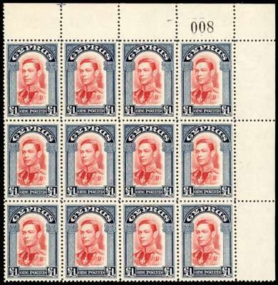 1938-53 £1 scarlet and indigo top right corner block of four with sheet number 008, unmounted o.g., nice and fresh. SG 163, £840