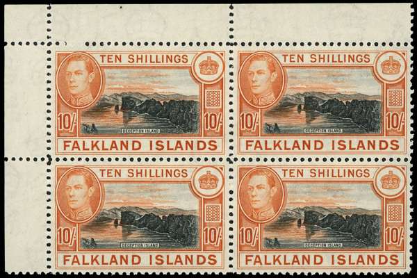 1944 printing of the 10/- in black and red-orange top left corner block of four, unmounted o.g. SG 162b, £520, Heijtz 92c
