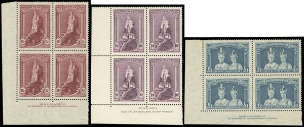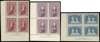 1938-48 Robes imprint blocks of four, unmounted o.g. with the £1 lightly hinged on the selvedge. The 10/- on thick paper, the 5/- and £1 thin. SG 176a, 177, 178a, £546