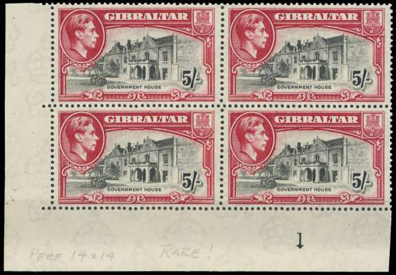 1938 5/- perf 14 lower left corner block of four with Vignette Plate 1, unmounted o.g. which is naturally streaky; very scarce so fine. SG 129, £440