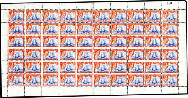 1939 printing of the 2/- deep ultramarine and orange-red in a complete sheet of sixty, unnumbered plate, with Waterlow imprint and sheet number 033. Central fold, otherwise in very good condition. SG 52, £840
