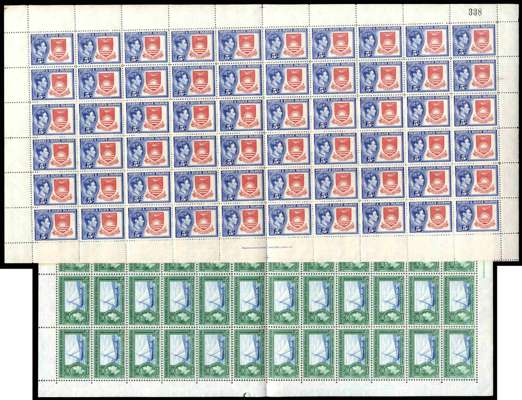 1939-55 2/6d and 5/- in complete o.g. sheets of sixty, both early printings but with decent gum, save the 2/6d with some foxing, mainly quite faint. The 5/- has a little peripheral foxing and some gum creasing. Each with sheet number, ex colony, impressive multiples and no doubt scarce. SG 53-4, £2220