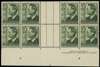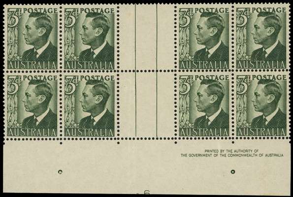 1951-3 3d grey-green interpanneau block of eight showing part of Plate -6- at base, large part o.g., lightly folded up gutter and with a tiny foxed spot in the gutter, otherwise fine. SG 237d, ASC 252zm, $3000