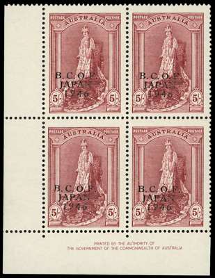 1947 5/- thick paper imprint block of four o.g., lower pair unmounted, hinge remainder on top left stamp otherwise fine. SG J7, £600, ASC J7za, $1500