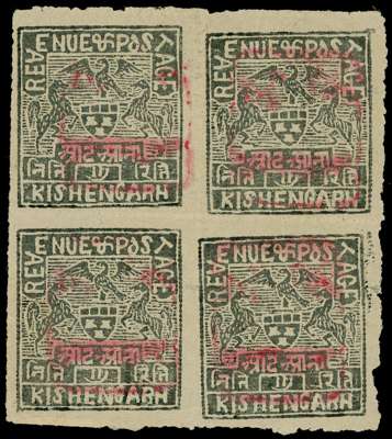 1948-9 red handstamp on Kishangarh 1904-10 8a grey block of four, unused; repair at the base of the lower left stamp. SG 25, £1000