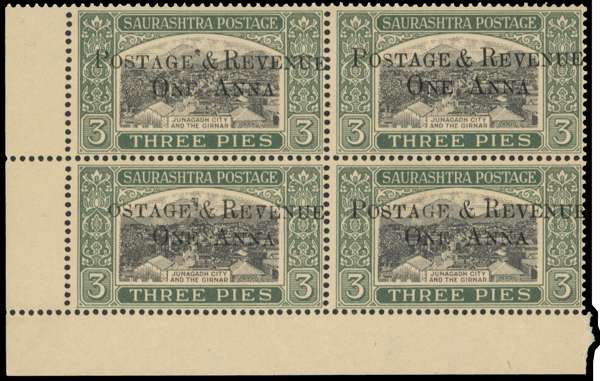 1950 1a on 3p black and blackish green lower left corner block of four, the lower left stamp with R8/1 OSTAGE. Unmounted o.g., with light even toning. SG 61, a, £620
