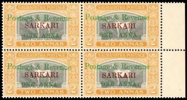 1949 1a on 2a grey and dull yellow marginal block of four, fresh unmounted o.g. SG O22, £600