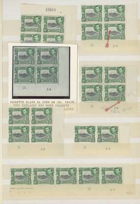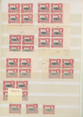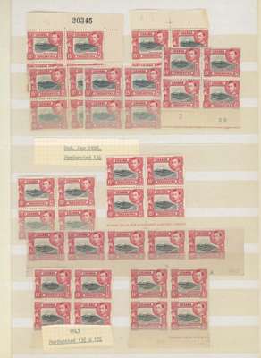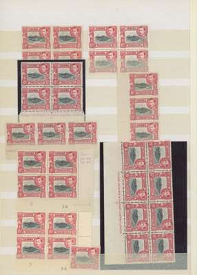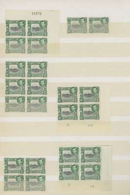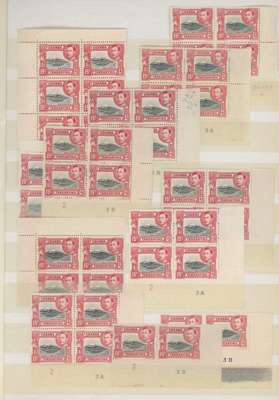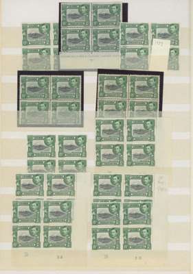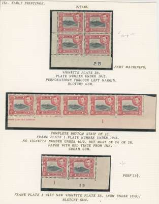 1938-54 15c mint collection on stocksheets, a good proportion unmounted. 1938 perf 13¼ six blocks of four, three with the stamps fully unmounted (one a Plate 2B corner block) with four further unmounted stamps, and an unmounted strip of ten across the bottom of the sheet without the usual streaky gum, FP 1 under R10/9, and an unmounted Plate 1-3B pair. Perf 13¾ x 13¼ 143 stamps including 12 Plate blocks and 5 Plate pairs; black and green 142 stamps with 15 Plate blocks, Plate strip and Plate pair; the Plate 3A-3B blocks with the R10/10 frame re-entry. A valuable collection. SG 137, a, 138
