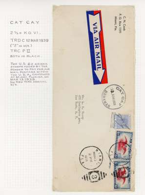 1939 envelope (9½ x 4") to New York with 2½d cancelled by “Marlin's Head”, circular Cat Cay TRD alongside (date altered from 10 to 12 MAR in manuscript); also with two US 6c Air cancelled at Miami on 13 MAR. The envelope with a fold at left; scarce