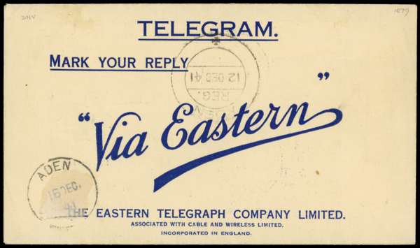 1941 Eastern Telegraph Co Telegram envelope, registered, bearing 2½a and 3a with GPO CDS of 12 DEC. Addressed to British Somaliland PMG “C/O POST ADEN”. Fine violet boxed CENSOR ADEN handstamp on front. further Aden CDSs of 12 and 16 DEC on reverse. Very pretty