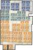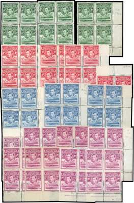 1938-54 mint blocks (37) plus 3 singles and 3 pairs, the majority being lower right corner blocks (mostly unnumbered; only the ½d and 2d had Plate numbers on later printings, and these are represented) or imprint blocks. All appear to be unmounted and all are dated in pencil on the selvedge; a great majority of the dates appear to be contemporary, which should guarantee a good measure of accuracy. Early printings are poorly represented. There is some duplication of printings but the collection is a fine resource. SG 18-28
