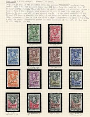 1938 set of eleven perforated SPECIMEN Type W8 or 8a, large part o.g. Additional 2d, 2/6d and 10/- with variations of the ‘S’ pins. The 1d and one of the 10/-s with minor perf faults. SG 118s-128s, £375+