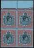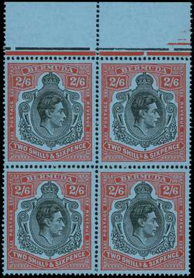 1943 (Mar.) 2/6d black and red on pale blue paper positional block of four, unmounted o,g,, with HPF #17 gash in chin. Really fine. SG 117b, bf, £910