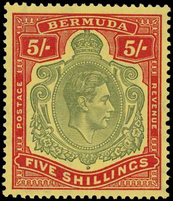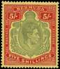 1941 (Nov.) 5/- bronze-green and carmine-red on pale yellow paper, lightly hinged mint. SG 118c, £1500