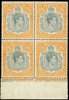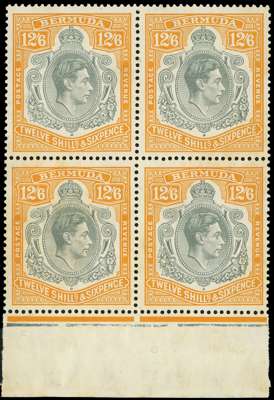 1940 (Oct) 12/6d grey and bright yellow-orange lower marginal block of four unmounted o.g., upper left stamp showing HPFs #45a and b. SG 120b, £440
