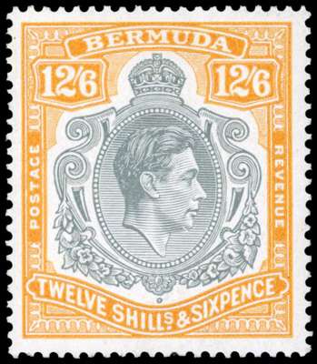 1943 (Mar) 12/6d grey and orange on ordinary paper, fine large part o.g., HPF #17 gash in chin. SG 120cf, £2500