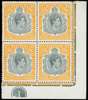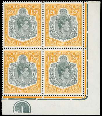 1950 (Aug) 12/6d grey and pale orange-yellow perf 13 on chalky paper lower right corner block of four with Plate number, HPFs #47, 48, 59b, 60b, c. O.g., lightly hinged on the selvedge only. SG 120e, £400