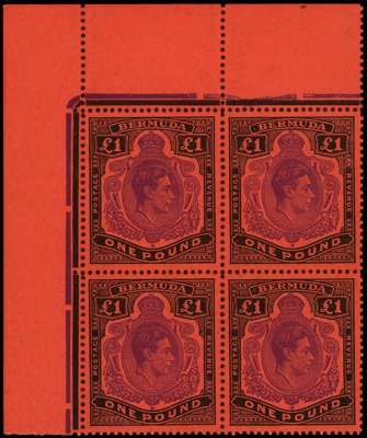 1952 £1 bright violet vignette, perf 13. Upper left corner block of four, #s 1-14 with appropriate HPFs, unmounted o.g. Scarce. SG 121e, £720