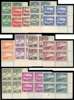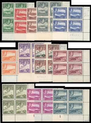 1938-51 set of twelve in lower right corner Plate blocks of four, all from unnumbered Plates sae for the 10/- and £1, unmounted o.g. Some with printing dates on the selvedge. SG 98-109, £520