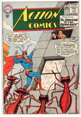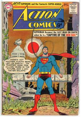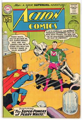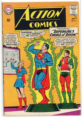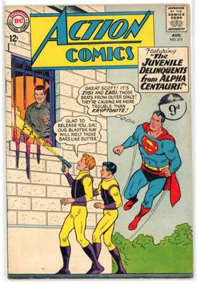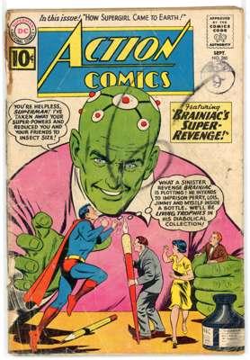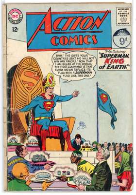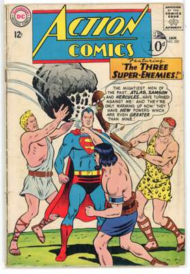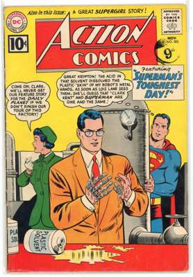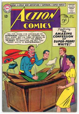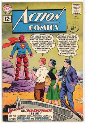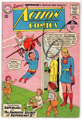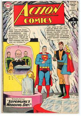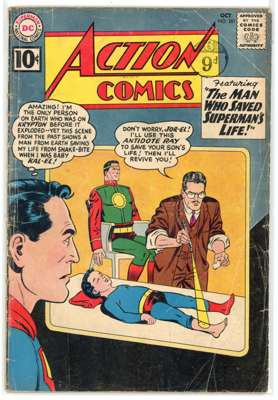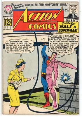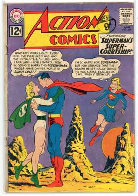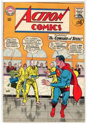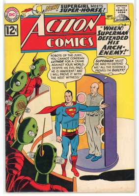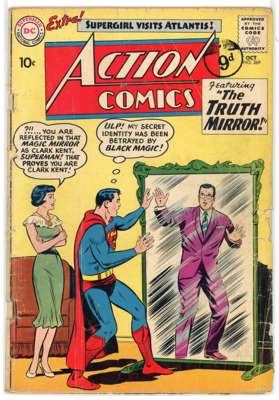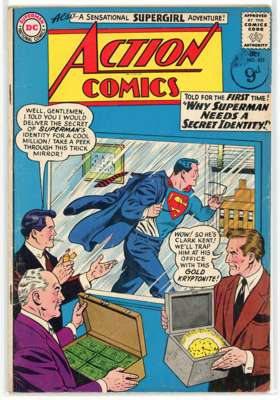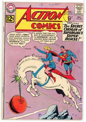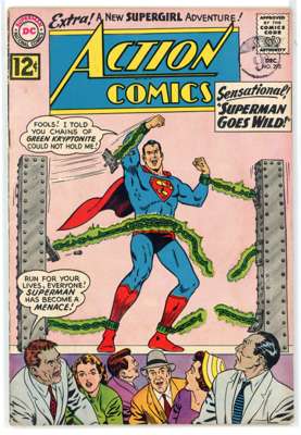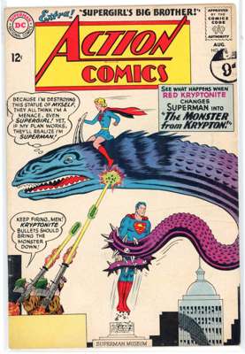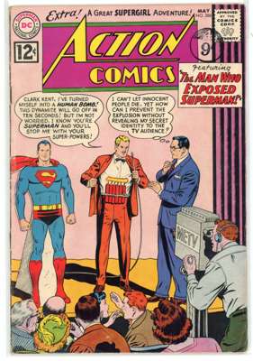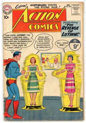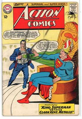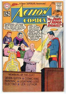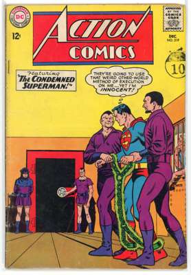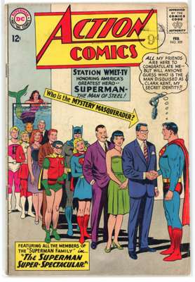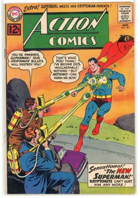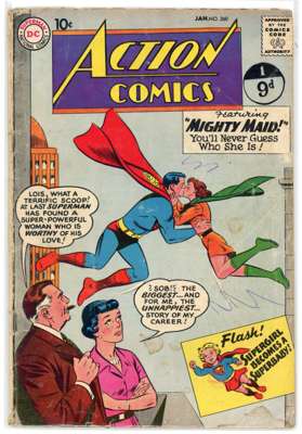 Action Comics (DC Comics 1959-1965) Bundle of 38 issues, bundle includes #259 (GD, spine has split from bottom staple downwards), #260 (GD), #296 (GD, spine has damage), #278 (VG), #279 (GD. First appearance of Lesla-Lar), #280 (GD, cover has detached from staples and split in two), #281 (GD), #282 (VG), #283 (VG), #284 (VG), #286 (VG), #287 (GD, cover is detached from both staples), #288 (VG), #289 (GD. First appearance of Luma Lunai), #290 (VG), #291 (GD, cover has detached from bottom staple. First meeting of Supergirl and Mr. Mxyzptlk), #293 ( VG. Origin of Comet the Superhorse), #295 (VG), #296 (FN), #299 (VG), #300 (VG), #302 (VG), #305 (VG), #306, #307 (VG/FN), #308 (VG), #309 (VG. Appearance of President John F. Kennedy who had been assassinated days before the issue went on sale, the mystery masquerader on the cover is JFK in disguise to help Superman conceal his identity), #311 (GD, cover has detached from top staple, major spine wear), #312 (VG), #314 (PR, missing part of back cover and front page), #314 (PR, missing part of back cover and front page), #315 (VG. First appearance Zigi and Zagi).