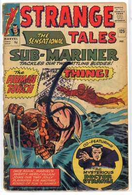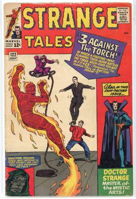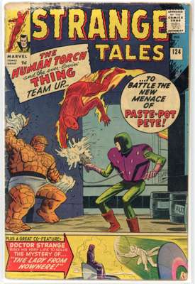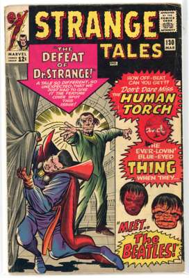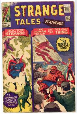 Strange Tales (Marvel Comics 1964-1966) Bundle of 13 issues, bundle includes #122 (VG. First full appearance of Nightmare, previous appearances obscured by shadows), #123 (FR/GD, tape to spine, heavy wear to cover. First appearance and origin of the Beetle, first crossover of Thor in the Strange Tales title), #124 (GD. Stories featuring The Thing and Human Torch begin, first mention of Cyttorak and Raggadorr, invoked by Doctor Strange), #125 (GD, spine has detatched from cover, major spine wear. Classic battle of the Human Torch and the Thing vs the Sub-Mariner), #130 (VG. First appearance of Kaecilius, a disciple of Baron Mordo, third appearance of Dormammu, Parody of the Beatles by the Human Torch and The Thing), #131 (GD, major cover wear), #132 (FN), #133 (VG), #134 (VG. first mention of Eternity, inal issue featuring Human Torch and the Thing as headliners, fourth appearance of Kang, a variant version of Prime Kang), #138 (VG/FN. First appearance of Eternity, twin brother of Infinity), #139 (VG, cover has detatched from top staple), #149 (VG/FN) and Strange Tales Annual #2 (FR/GD, tape to spine, heavy wear to cover. First team-up of the Human Torch and Spider-Man)