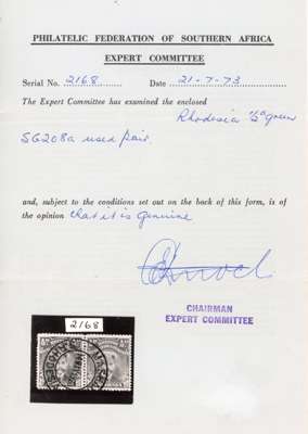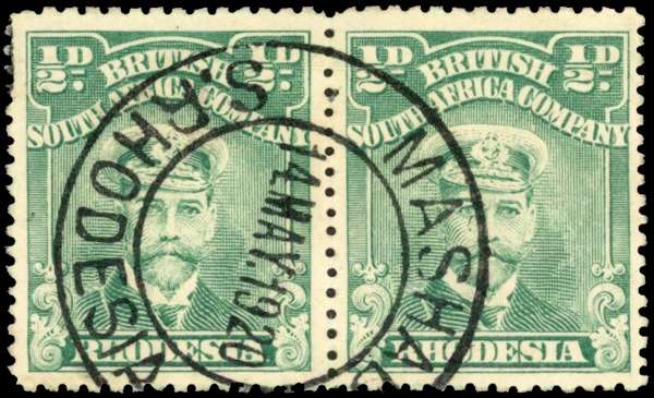 ½d dull blue-green perf 15 x 14 used horizontal pair, with large part lovely Mashaba CDS 14 MAY 1920. Wonderful quality, ex ‘Dallas’. PFSA Certificate (1973). SG 208a