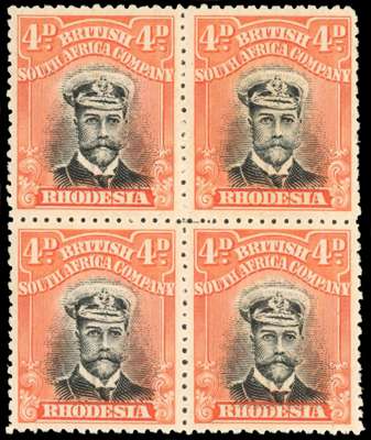 Rhodesia 4d SG 225b block with full printer's mark mint