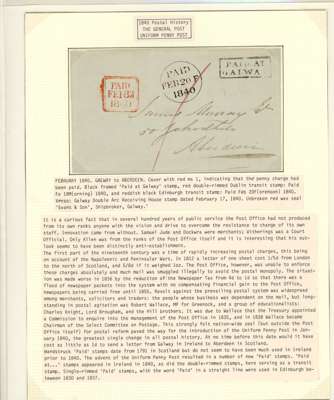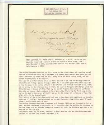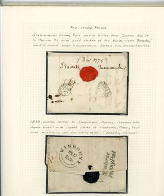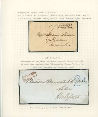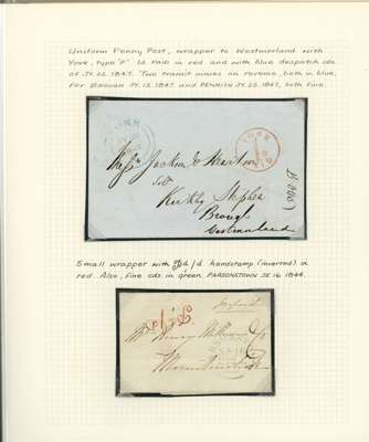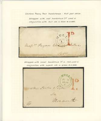 1775-1847 Postal History. Small collection containing a 1775 Government Penny Post entire with Westminster Thursday handstamp and 12 o’clock handstamp, 1780 entire from France to Cambridge with 31/JY Bishop mark, 1828 Entire to Norwich with very fine boxed ‘Ixworth Penny Post’ handstamp on face, 1839 Entire to Limpsfield with superb ‘Wimborne/Penny Post’ handstamp, 1839 Fourpenny Post period (Dec. 31) entire to London with black manuscript ‘4’, 1840 entire to Aberdeen with boxed ‘PAID AT/GALWAY’ handstamp, 1840 entire to Halifax with red ‘Todmorden/Penny Post’ handstamp and large blue ‘2d’ due handstamp, 1843-44 two entires from Hull with different red hand struck ‘1D’ UPP handstamps, 1844 entire with very fine red Parsonstown ‘Pd, 1d’ UPP handstamp, 1847 cover with ‘YORK/1D/PAID’ UPP handstamp and 1821 copy of the Morning Herald sent postally with red fourpence handstamp. An interesting group overall very fine or better.
