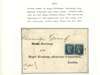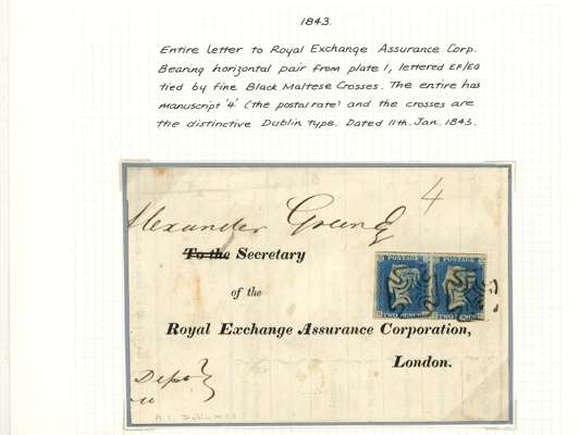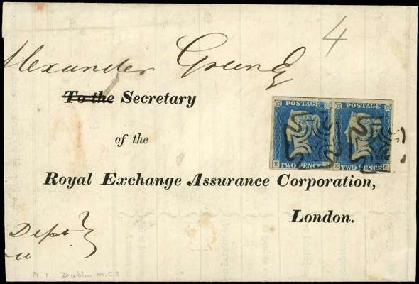 1840 2d Blue. Partial pre-printed entire sent from Dublin to London bearing a horizontal pair of 2d Blue (SG 5, Pl.1.) lettered EF-EG tied by distinctive Dublin MC's just shaved at foot of EG. Manuscript “4” at top right indicating postal rate. Dublin datestamp on reverse JA.11.1843. Spec. DS5vc. Cat £7,000 for a single Dublin MC on cover.