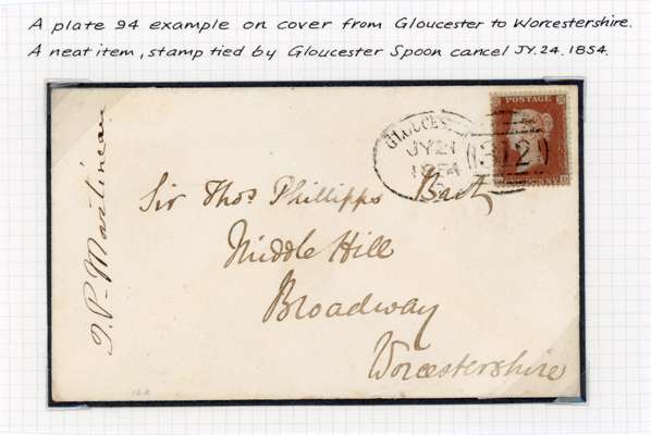 1850 1d Red-brown “Archer“ Pl.94. Clean envelope sent from Gloucester to Broadway bearing a 1d Red-brown Pl.94 lettered RD, tied by a Gloucester ‘312’ Spoon cancellation. Backstamped by a Broadway arrival for the following day. Scarce cancellation on this perforation trial. Spec. CE2. Cat. £1700.