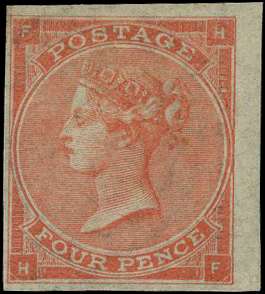 1863 4d pale red Pl.4. Very fine unused large part o.g. four margin imperforate example lettered HF. Scarce. SG82a 1987 RPS Certificate. Cat. £2400
