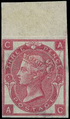 1865 3d rose Pl.5 (Wmk. Emblems). Very fine unused (no gum) top marginal close to large four margin imperforate imprimatur lettered AC, Scarce only 22 possible examples. SG92var Cat. £4250