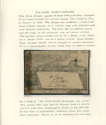 Mulready Caricatures & Pictorial Envelopes. Small group containing Fores’s No.1 ‘Courting’ and No.3 ‘Dancing’ envelopes, both hand coloured, although with some foxing and toning, Spooner No.5 ‘The Posts’ and No.13 ‘Military’ again both hand coloured and in fine condition. Also a used example of Hume’s ’50 Miles around Edinburgh and Leith’ envelope No.3. state D, addressed to Dunse but has unfortunately lost the original stamp, somewhat fragile and quite heavily stained at left, nevertheless very rare despite the faults (5 items).