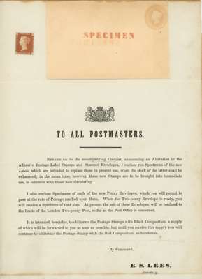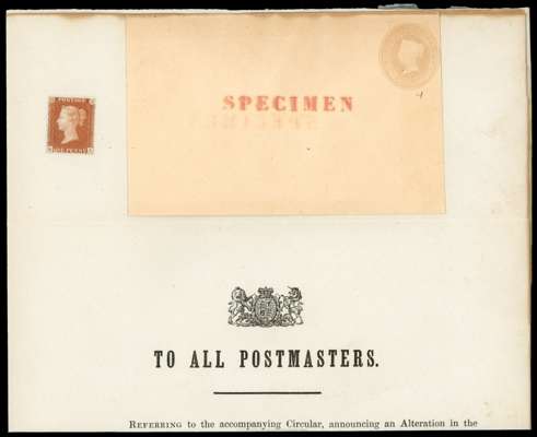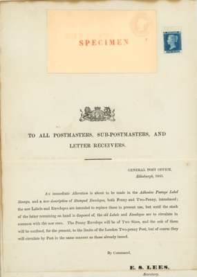 1841 Postal Notice referring to the issue of the new 1d and 2d stamps and 1d pink stationery envelopes. The 1d red is from 1d black SG 7 plate 10 and the 2d blue is a proof with void letter squares SG DP43. Spec. PN8.